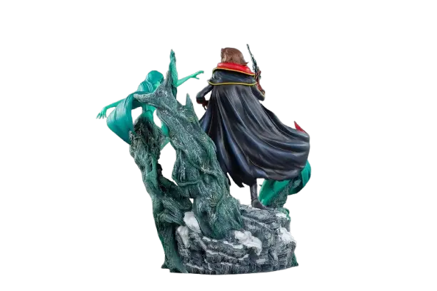 Réalisée à l’échelle 1/6e, la statue est limitée à seulement 750 exemplaires et sera accompagnée de son certificat d’authenticité et de sa notice d’assemblage. Dimensions : H44 x L42 x P32 cm Nous avons choisi pour cette statue une scène emblématique de l’anime dans laquelle Albator se rend en Amazonie ou il se retrouve rapidement attaqué par des Sylvidres végétales. Le socle représente la jungle tropicale avec au sol de la neige, le froid étant le seul moyen de mettre hors d’état de nuire les Sylvidres. Le socle fourmille de détails, plantes, lianes, écorces et bien sur nous y retrouvons des Sylvidres qui pour certaines d’entre elles sont en train de reprendre leur apparence originale. Albator est quant à lui au centre de la statue, arme à la main, prêt à faire face aux ennemis qui l’entoure. Les proportions si spéciales du personnage sont respectés, lui qui est longiligne tout en restant si charismatique. Le célèbre Corsaire, ainsi que les Sylvidres, ont représenté un véritable challenge en peinture. Les contrastes ont permis de donner de la profondeur à son costume pourtant dénué de toute texture. Des reflets bleutés sur les parties noires rappelant la pénombre, aux variations de métalliques sur ses armes, tout a été pensé pour garantir une réelle harmonie au niveau des couleurs. La peinture avait pour but de retranscrire le froid de la scène, les Sylvidres étant en pleine métamorphose. Leur intégration au socle s’est faite par des dégradés tirant de plus en plus vers une teinte écorce. Ainsi, la Sylvidre présente sur le bas du socle est encore consciente alors que sa transformation opère. Le vert de sa peau est encore visible, mais la texture d’écorce s’empare peu à peu d’elle. Pour la neige, nous avons appliqué un flocage sur le sol et les arbres qui entoure le socle.