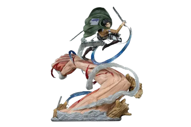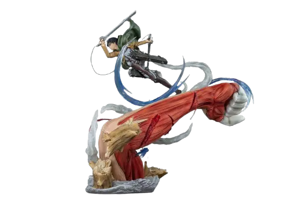 La statue met en scène le charismatique Caporal-Chef Levi lors de son combat contre le Titan Féminin. Assurément l’une des scènes les plus marquantes de la première saison de l’anime ou l’on peut voir toute la puissance du personnage qui mettra rapidement hors d’état de nuire son ennemi en portant des coups à la vitesse de l’éclair.
