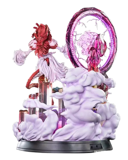 La base est un monde minéral composé d’une plaque de cristal en résine transparente aux reflets violets, d’un anneau de cristal fuchsia et du Cristal de Vie, tous deux en résine transparente vernie. La sphère violacée, sculptée à la main, qui la protège, délivre un message essentiel. Son visage partiellement détruit symbolise le chaos, motivation ultime de Kuja, tandis que son visage rond et plein représente la vie et l’harmonie, défendues par Zidane. Les cristaux orange entrelacés avec les nuages ​​forment une arène, mettant en valeur l’ensemble. Le Cristal de Vie, au centre de l’anneau, symbolise la planète vie, sa couleur variant selon son bien-être. Comme on peut le constater, si son énergie vitale est positive, le cristal révèle des teintes bleutées, mais s’il court un grand danger, ces reflets deviennent rouges, comme la fourrure de Kuja, lui-même animé par le mal.