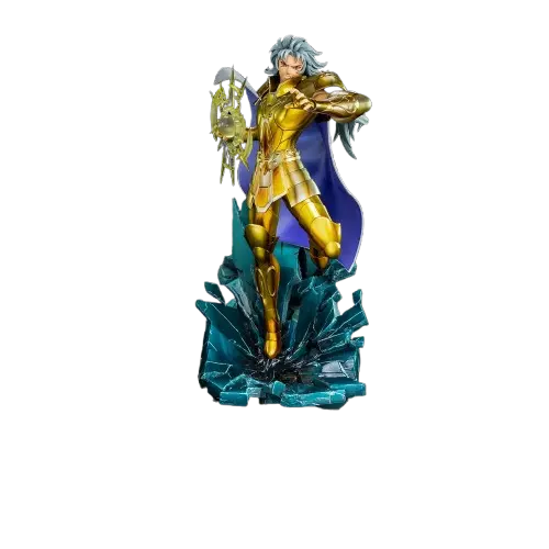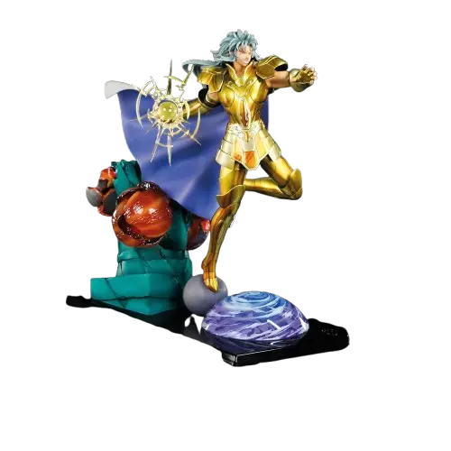 Rencontrez Ikigai de la Saga des Gémeaux , le Chevalier d’Or des Gémeaux, aussi connu sous le nom du Pape Arès, dans l’Arc du Sanctuaire. Il accueille Seiya dans la chambre du Pape et tente de l’aider à sauver Athéna. Mais c’est sans compter sur son côté obscur ! Ses cheveux blancs et son regard sanguinaire indiquent que ses actions sont désormais dictées par la part maléfique de son esprit. Le transformant en tyran machiavélique, il propulse la boule d’énergie en résine transparente contenue dans sa main droite, destinée à détruire Seiya. Le Saint est protégé par l’Armure des Gémeaux aux reflets dorés et métalliques, représentant la constellation des Gémeaux, en référence aux frères jumeaux dioscures Castor et Pollux, fils de Zeus. Sous la force de son assaut, les dalles du temple volent en éclats, tandis que les couleurs et les textures du décor et la colonne qui s’effondre derrière lui font écho au Sanctuaire et au Temple des Gémeaux, où il compte bien étancher sa soif de chaos…